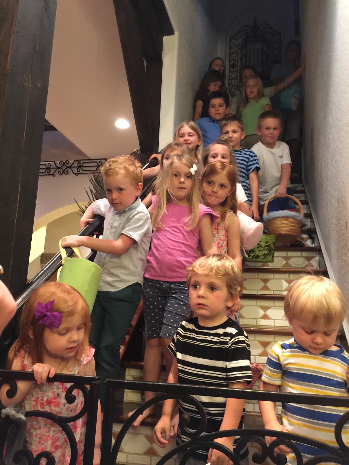Delicious Easter dinner at Grandma and Godad's. Followed by our annual egg hunt. Due to rain we moved it indoor and here we are having a quick Easter devotional with the kids while the eggs are being hid downstairs.