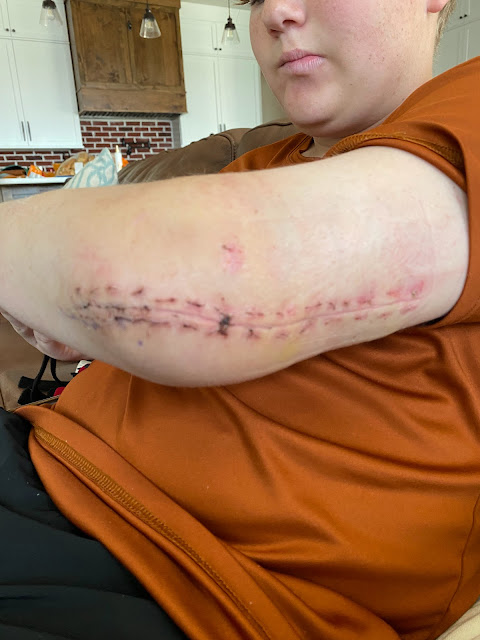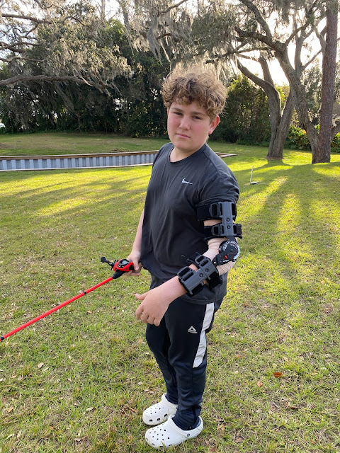 2 weeks post op appointment and they unwrapped the arm!! We had been dying to see the stitches and the incision. It was pretty gnarly!! They took all the stiches out and took more x-rays. Everything was looking great. They ordered Physical Therapy for 6 weeks and wants him to return the end of February. They also put him in a new brace and told him to move that elbow as tolerated. Seems a little risky to me but he's been doing amazing with it. Can even go fishing!!